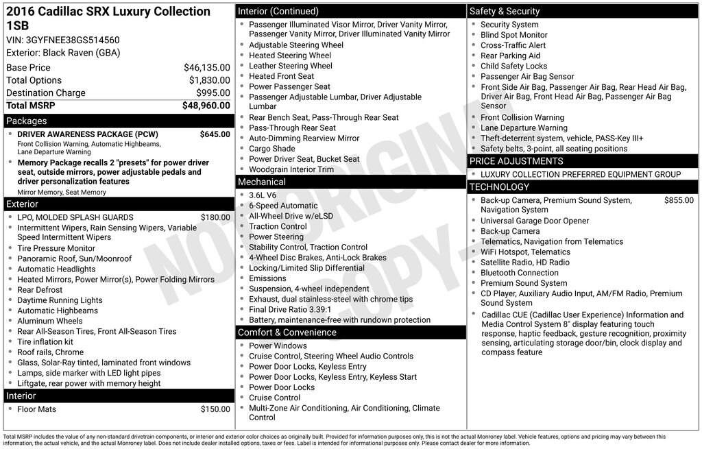 Recent Arrival! Clean CARFAX.Black Raven 2016 Cadillac SRX Luxury AWD 4D Sport Utility 3.6L V6 DGI DOHC VVT 6-Speed Automatic AWDTHIS IS A FRESH TRADE THAT HAS NOT AND WILL NOT BE SERVICED. SOLD COMPLETELY AS IS AS WAS TRADED. SOLD WITH ABSOLUTELY NO GUARANTEES AT ALL. THIS IS JUST AN ALTERNATIVE TO TAKING IT TO THE AUCTION PASSING THE SAVINGS TO THE CONSUMER!!!Car shopping is sometimes inconvenient and stressful, and we want to take the hassle out of this all-too-common experience. If youâre interested in more convenience, less frustration and a process that works efficiently to meet your needs as a customer. Al BAUMANN AUTO GROUP. The Best Price Up Front Cash Offers For Any Trade-In Multiple Financing Quotes In Minutes A Team Of Dedicated Salespeople.CALL,419-332-8236 or {1-866-330-3601}, AWD, 8-Way Power Front Passenger Seat Adjuster, Adaptive Remote Start, Automatic Air Circulation/Air Quality Sensor, Body-Color Heated Power-Adjustable Outside Mirrors, Bose Centerpoint Surround Sound 10 Speaker System, Cabin Humidity Sensor, Choco Sapele Wood Trim On Door & Center Stack, Choco Sapele Wood Trim On Steering Wheel/Shift Knob, Chrome Roof Rails, Driver & Front Passenger Heated Seats, Driver & Front Passenger Power Lumbar Control, Driver Awareness Package, Forward Collision Alert, Front & Rear Park Assist, Inside Rear-View Auto-Dimming Mirror, IntelliBeam Headlamps, Keyless Access, Lane Departure Warning System, LED Spotlights w/Lighting Pipes, Memory Package, Navigation System, Power UltraView Double-Sized Sunroof, Preferred Equipment Group 1SB, Rainsense Wipers, Rear Cross-Traffic Alert, Rear Power Liftgate w/Memory Height, Rear Storage Area Cargo Management, Rear Vision Camera, Shale & Titanium Retractable Cargo Shade, Side Blind Zone Alert, Universal Home Remote, 18 x 8 Bright Machined Finish Aluminum Wheels, 3.39 Final Drive Ratio, 4-Wheel Disc Brakes, 4-Wheel Independent Suspension, 8 Speakers, ABS brakes, Air Conditioning, All-Weather Floor Mats, Alloy wheels, AM/FM radio: SiriusXM, AM/FM Stereo w/Single Disc CD Player, Auto-dimming door mirrors, Auto-dimming Rear-View mirror, Automatic temperature control, Bose Premium 8-Speaker Audio System Feature, Brake assist, Bumpers: body-color, CD player, Compass, Delay-off headlights, Driver door bin, Driver vanity mirror, Dual front impact airbags, Dual front side impact airbags, Electronic Stability Control, Emergency communication system: OnStar Guidance, Exterior Parking Camera Rear, Four wheel independent suspension, Front anti-roll bar, Front Bucket Seats, Front Center Armrest w/Storage, Front dual zone A/C, Front reading lights, Fully automatic headlights, Garage door transmitter, Genuine wood door panel insert, Heated door mirrors, Heated front seats, Heated steering wheel, Illuminated entry, Leather Seating Surfaces, Leather Shift Knob, Leather steering wheel, Low tire pressure warning, Memory seat, Molded Splash Guards, Occupant sensing airbag, Outside temperature display, Overhead airbag, Overhead console, Panic alarm, Passenger door bin, Passenger vanity mirror, Power door mirrors, Power driver seat, Power Liftgate, Power moonroof, Power passenger seat, Power steering, Power windows, Premium audio system: Cadillac CUE, Radio data system, Rain sensing wipers, Rear anti-roll bar, Rear reading lights, Rear seat center armrest, Rear window defroster, Rear window wiper, Remote keyless entry, Roof rack: rails only, Security system, SiriusXM Satellite & HD Radio, Speed control, Split folding rear seat, Spoiler, Steering wheel mounted audio controls, Tachometer, Telescoping steering wheel, Tilt steering wheel, Traction control, Trip computer, Variably intermittent wipers, Voltmeter, AWD, 8-Way Power Front Passenger Seat Adjuster, Adaptive Remote Start, Automatic Air Circulation/Air Quality Sensor, Body-Color Heated Power-Adjustable Outside Mirrors, Bose Centerpoint Surround Sound 10 Speaker System, Cabin Humidity Sensor, Choco Sapele Wood