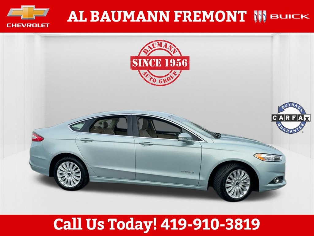 Odometer is 56263 miles below market average! CARFAX One-Owner.Ice Storm Metallic 2014 Ford Fusion Hybrid SE FWD 4D Sedan 2.0L I4 Atkinson-Cycle Hybrid E-CVT Automatic FWDONLY ONE OWNER.Car shopping is sometimes inconvenient and stressful, and we want to take the hassle out of this all-too-common experience. If youâre interested in more convenience, less frustration and a process that works efficiently to meet your needs as a customer. Al BAUMANN AUTO GROUP. The Best Price Up Front Cash Offers For Any Trade-In Multiple Financing Quotes In Minutes A Team Of Dedicated Salespeople.CALL,419-332-8236 or {1-866-330-3601}, 2.0L I4 Atkinson-Cycle Hybrid, 110V Power Outlet, Auto High Beams, BLIS w/Cross Traffic Alert, Chrome Moldings Around Window, Electrochromic Exterior Mirrors, Electrochromic Rear-View Mirror, Equipment Group 502A, Fog Lamps, Heated Leather Front Bucket Seats, Lane Departure Warning w/Lane Keeping System, Leather Wrapped Gearshift Knob, Leather-Wrapped Steering Wheel, LED Rear Combination Lamps Ford High (Full Circle), Luxury Package, Rain-Sensing Wipers, Rear-view Camera, SE Luxury Driver Assist Package, SE MyFord Touch Technology Package, SYNC w/MyFord Touch, Warm Interior Accents, 17 Unique Aluminum Wheels, 4-Wheel Disc Brakes, 6 Speakers, ABS brakes, Air Conditioning, Alloy wheels, AM/FM radio: SiriusXM, Automatic temperature control, Brake assist, Bumpers: body-color, CD player, Compass, Delay-off headlights, Driver door bin, Driver vanity mirror, Dual front impact airbags, Dual front side impact airbags, EcoCloth Front Bucket Seats, Electronic Stability Control, Four wheel independent suspension, Front anti-roll bar, Front Bucket Seats, Front Center Armrest, Front dual zone A/C, Front reading lights, Fully automatic headlights, Heated door mirrors, Illuminated entry, Knee airbag, Low tire pressure warning, Moonroof, Occupant sensing airbag, Outside temperature display, Overhead airbag, Overhead console, Panic alarm, Passenger door bin, Passenger vanity mirror, Power door mirrors, Power driver seat, Power steering, Power windows, Radio data system, Radio: AM/FM Stereo/MP3/Single-CD, Rear anti-roll bar, Rear reading lights, Rear seat center armrest, Rear window defroster, Remote keyless entry, Reverse Sensing System, Security system, Speed control, Speed-sensing steering, Speed-Sensitive Wipers, Split folding rear seat, Steering wheel mounted audio controls, SYNC Communications & Entertainment System, Tachometer, Telescoping steering wheel, Tilt steering wheel, Traction control, Trip computer, Turn signal indicator mirrors, Universal Garage Door Opener, Variably intermittent wipers, 2.0L I4 Atkinson-Cycle Hybrid, 110V Power Outlet, Auto High Beams, BLIS w/Cross Traffic Alert, Chrome Moldings Around Window, Electrochromic Exterior Mirrors, Electrochromic Rear-View Mirror, Equipment Group 502A, Fog Lamps, Heated Leather Front Bucket Seats, Lane Departure Warning w/Lane Keeping System, Leather Wrapped Gearshift Knob, Leather-Wrapped Steering Wheel, LED Rear Combination Lamps Ford High (Full Circle), Luxury Package, Rain-Sensing Wipers, Rear-view Camera, SE Luxury Driver Assist Package, SE MyFord Touch Technology Package, SYNC w/MyFord Touch, Warm Interior Accents.